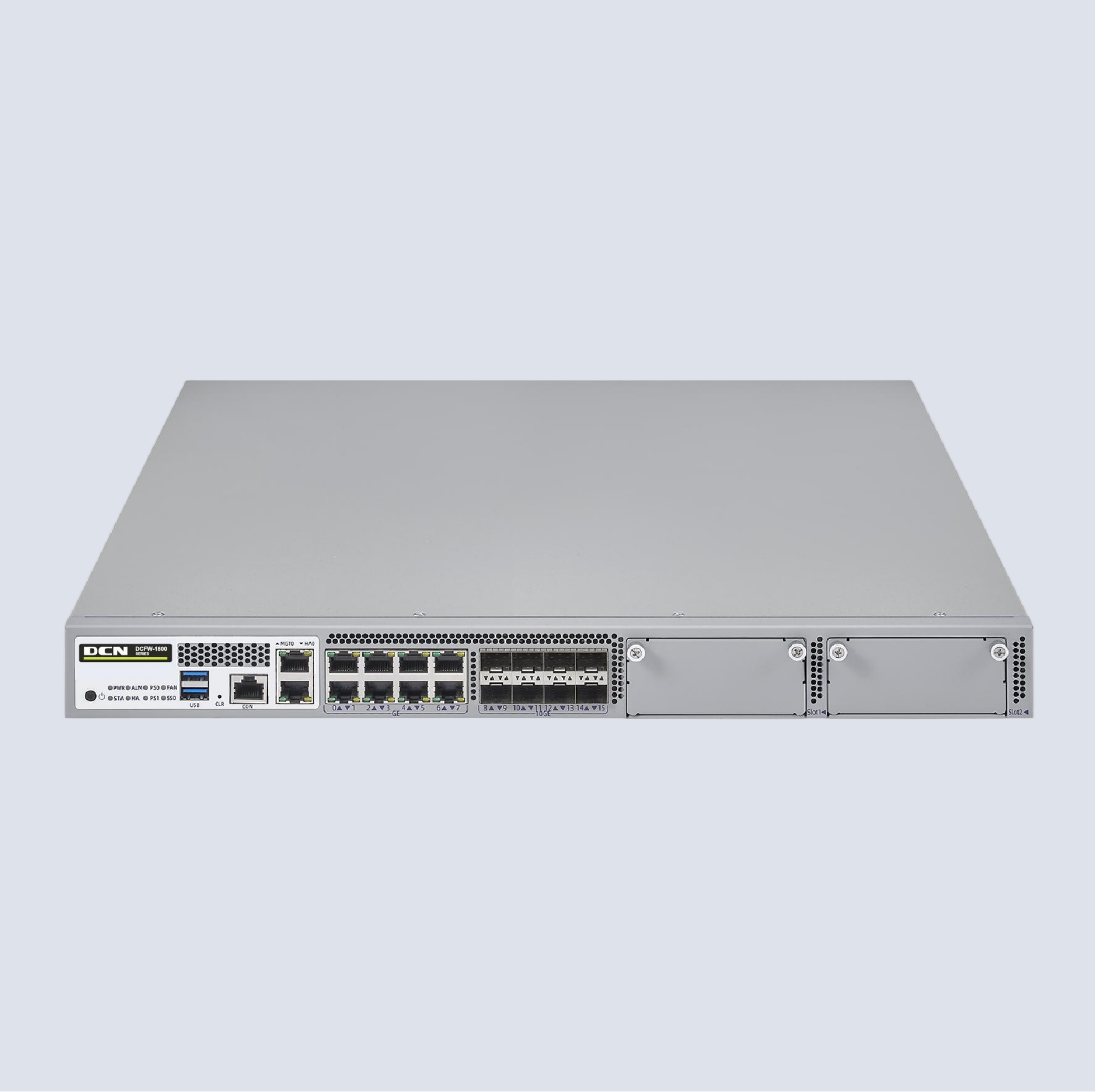 DCFW-1800-N5880-G 软硬件平台基本系统,含硬件保修、应用识别库升级和软件升级维护服务。硬件参数:1U,1 个CON 口,1 个MGT口,1个HA口,2个USB口,8个千兆电+8个万兆光口,2个通用扩展槽。